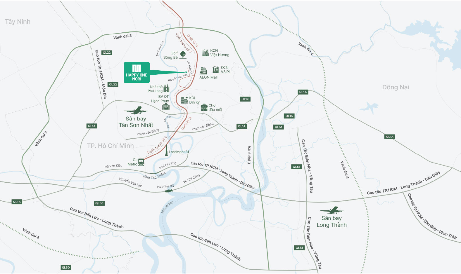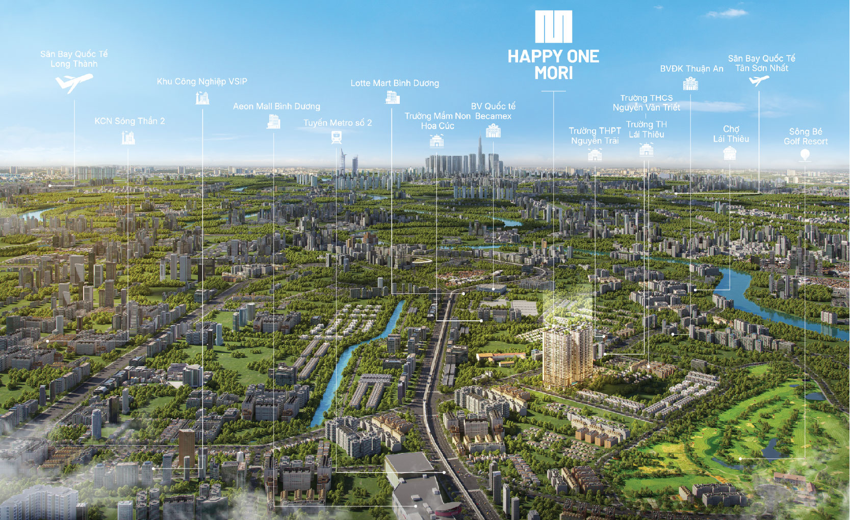 Tọa lạc tại vị trí đắc địa, Happy One Mori không chỉ là cầu nối chiến lược giữa TP.HCM và các khu công nghiệp trọng điểm, mà còn là tâm điểm của một hệ sinh thái tiện ích nội khu đa dạng, đáp ứng trọn vẹn nhu cầu an cư – làm việc – giải trí. Mỗi căn hộ là một tổ ấm lý tưởng, được thiết kế thông minh để tối ưu công năng và đón trọn ánh sáng tự nhiên, mở ra một không gian sống đầy cảm hứng cho cư dân Happy One Mori.